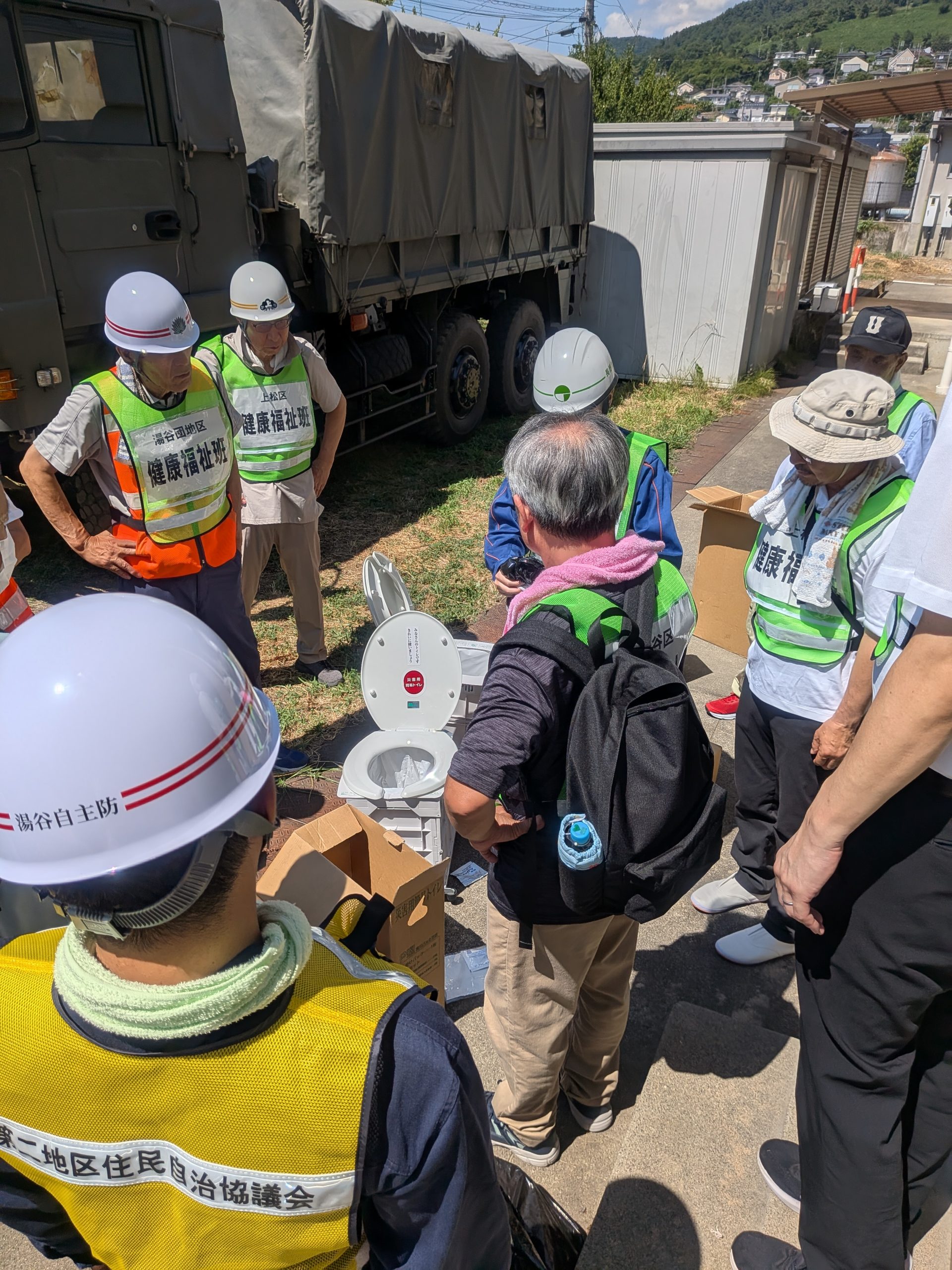 令和7年7月26日(土)、地附山地滑り40年を迎え第二地区を対象とした大規模防災訓練が行われ、区長部会として視察に行きました。当日は、朝8時30分から防災無線により避難を呼びかけ、湯谷小学校へ第二地区(湯谷団地・湯谷・上松)の住民が避難することから始まりました。訓練は第一会場の地附山公園(消防をはじめ関係機関で専門的な訓練)と第二会場の湯谷小学校で行われ、区長部会では第二会場の視察に伺いました。内容は、避難・誘導訓練、避難所受付訓練、応急手当訓練、避難所設置訓練、支援物資搬送訓練、上空偵察訓練、避難スペース設置訓練、飲食・給水訓練、AR災害疑似体験、車両・防災資機材展示、など多岐にわたる総合訓練が行われました。特に、支援物資搬送訓練では、県防災ヘリコプターにより実際に資材を搬送、湯谷小学校校庭に離着陸しての訓練を行いました。今後も、長野県が主体となり、長野市・第二地区住民自治協議会・消防局・消防団・自衛隊が一体となったこうした大規模訓練を毎年行っていく予定とのことです。
