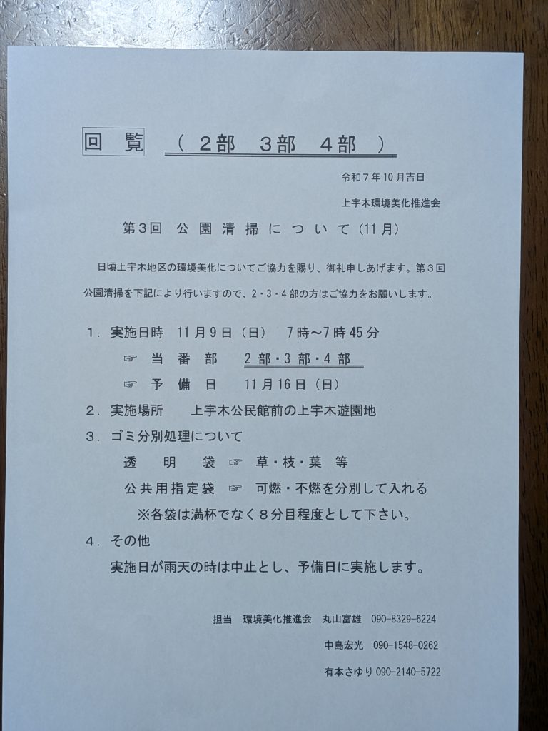 上宇木環境美化推進会よりお知らせ(第3回公園清掃について)